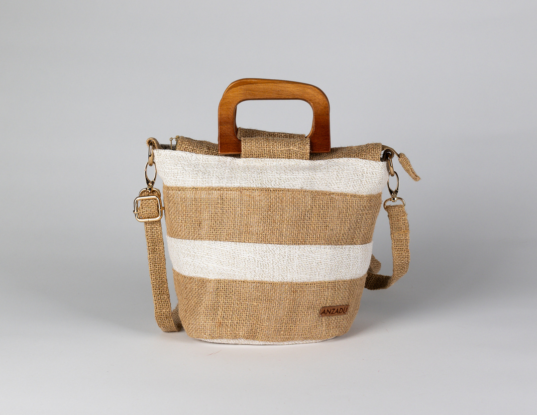 Hecho a mano con tela de yute, asas de madera y una entretela de calidad  para asegurarnos su perfecto estado durante años. El bolso Arena es ideal para hacer infinitas combinaciones de estilos, gracias a su estética minimalista y elegante, esto sin olvidarnos de su ligereza y practicidad. Los destellos dorados de la tela, marcarán un antes y un después en tus outfits. ¡Prepárate para deslumbrar con este bolso que combina estilo y utilidad en una sola pieza!