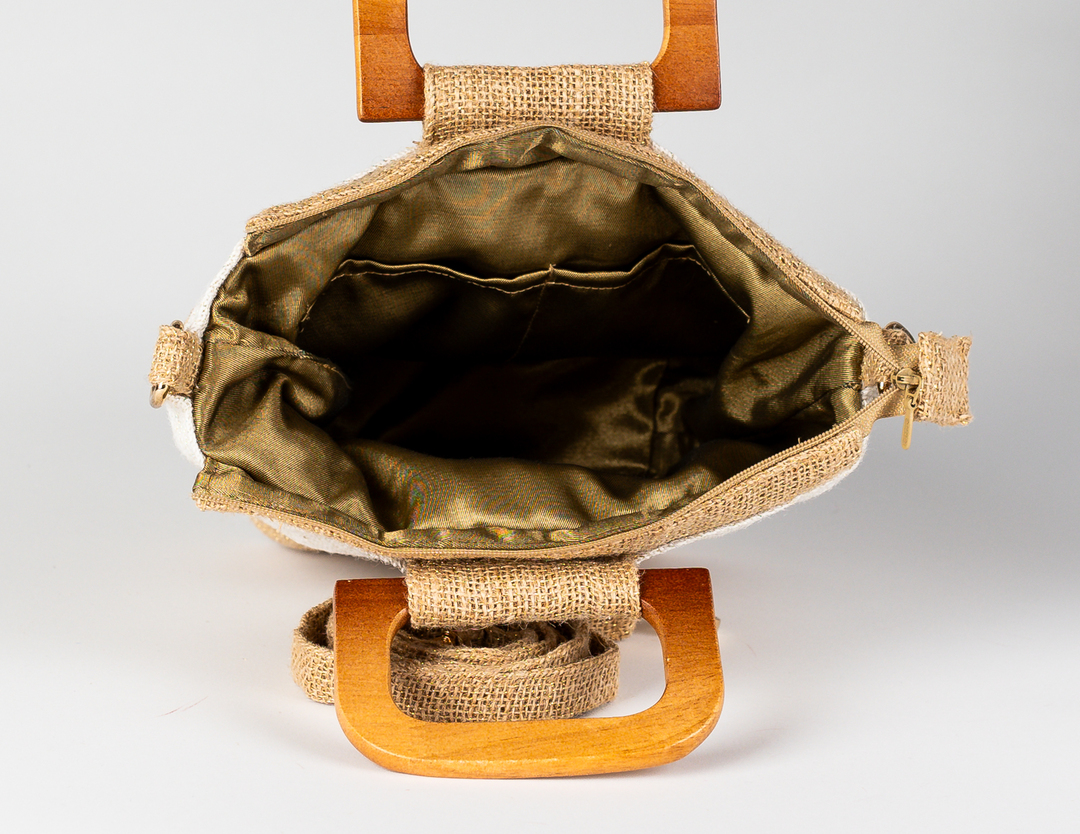 Bolso de yute, tejidos con destellos dorados, vista interior en tela de raso.