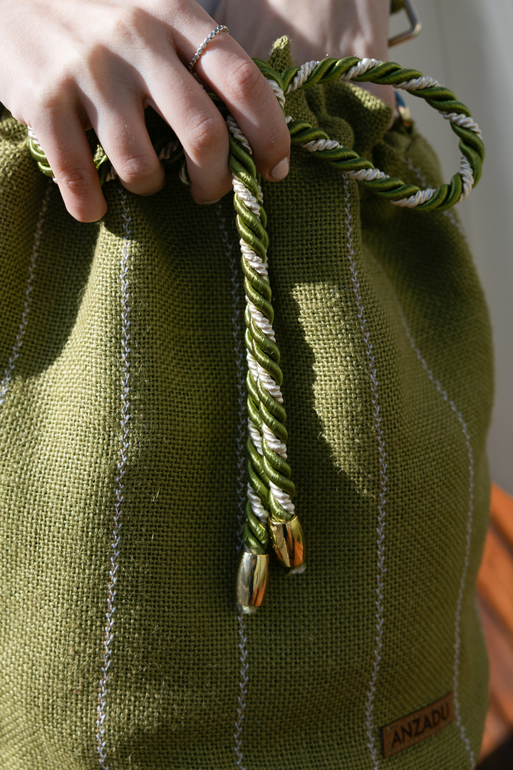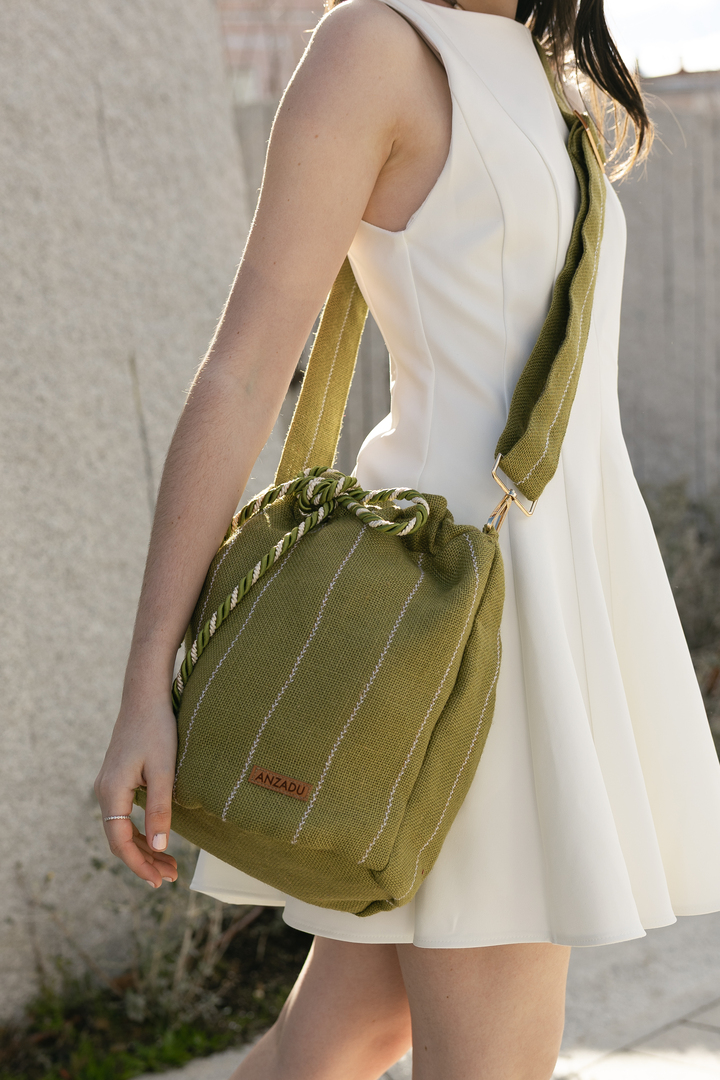Destaca no solo por su diseño único y su artesanía, sino también por la comodidad que ofrece en el uso del día a día. Así es nuestro bolso de yute Salei verde. Elaborado en tejido de yute, teñido con tintes naturales y tela de raso en su interior, le otorga un toque de funcionabilidad y autenticidad perfecto para combinar con cada uno de tus outfits. Cada bolso está diseñado pensando en la mujer moderna, práctica y amante de los detalles. La combinación de colores que tiene su cordón entrelazado y las líneas bordadas en la tela hechas de manera artesanal, le aportan un soplo de aire fresco a nuestra colección. En Anzadu, trabajamos con materiales de alta calidad para garantizar la durabilidad y el estilo. Haz de esta primavera una temporada inolvidable.