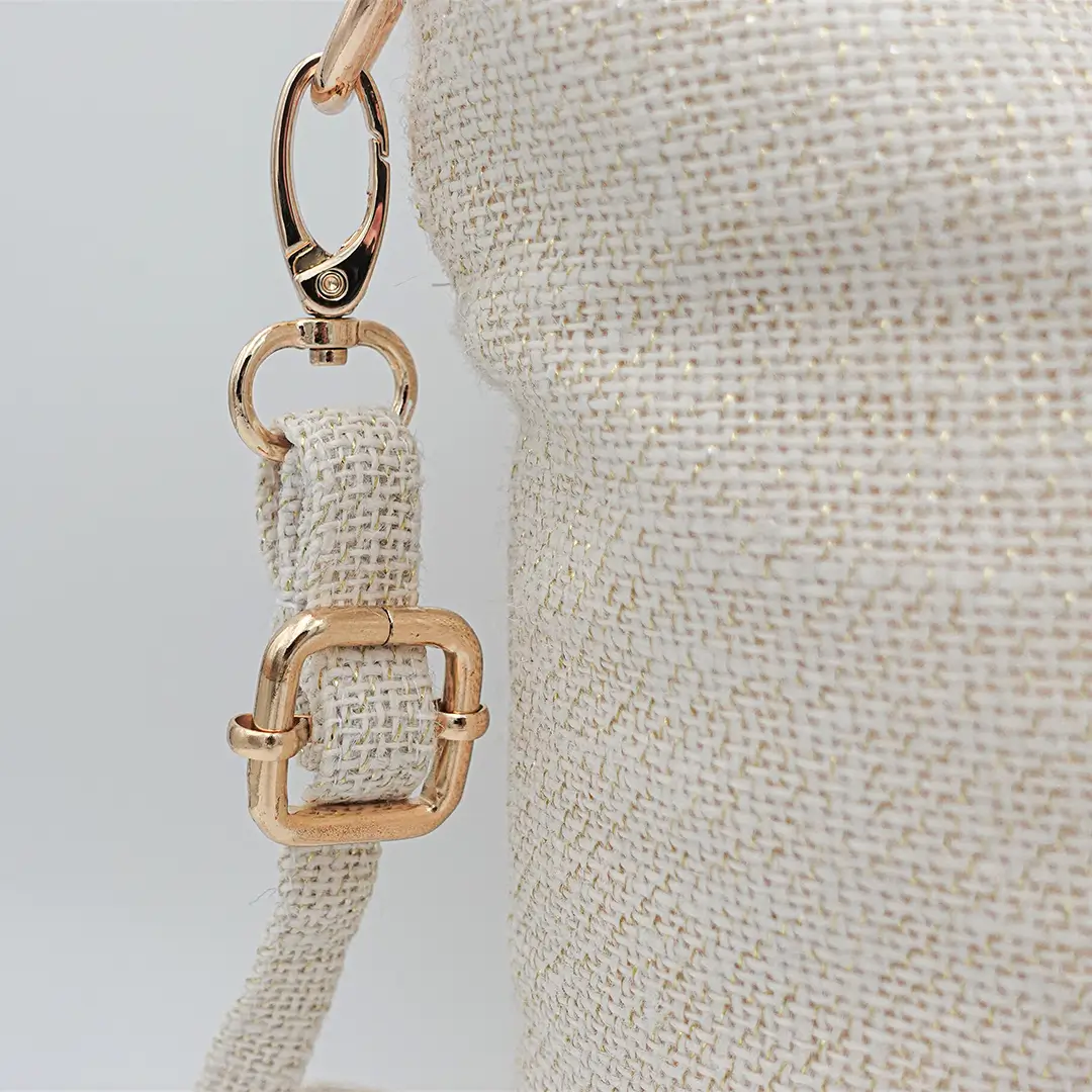 El bolso Levisa Gilt es perfecto para complementar tus atuendos. Su diseño minimalista y elegante te permite combinarlo con cualquier estilo. Está fabricado de manera artesanal. Con tela de yute en su exterior, tejido de raso en su interior, una entretela de calidad, asas rígidas de resina y una larga correa ajustable para asegurarnos su perfecto estado durante años, el bolso Levisa Gilt es ideal para llevártelo a todas partes. ¡Prepárate para deslumbrar con este bolso que combina estilo y utilidad en una sola pieza durante todo el verano!