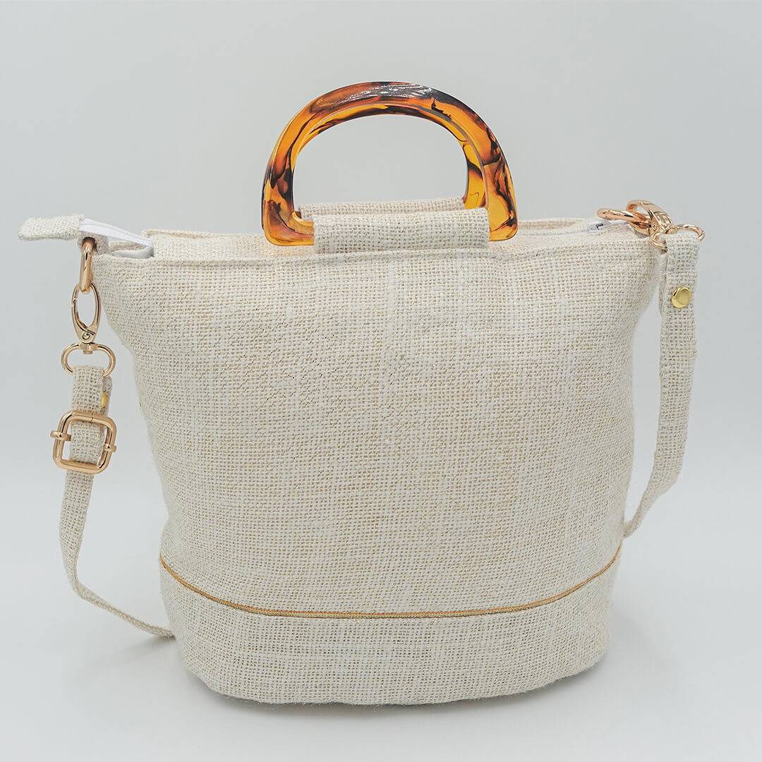 Nuestro bolso de yute Levisa Gilt, es sin duda alguna el compañero perfecto para llevar todo lo que necesitas y más. Su cuidadosa elaboración en tejido de yute teñido con tintes naturales le brinda un aspecto elegante y único. El Yute realizado a base de fibras vegetales gruesas e históricamente empleado como un producto de carga por su fortaleza, se interpreta hoy en múltiples artículos como es el caso de este bolso. Su estructura abierta, de entramado sencillo y transpirable, se degrada de manera natural apostando por la responsabilidad ambiental en cada ejemplar. Además de ser sumamente práctico, su entretela de calidad asegura que siempre mantenga su forma. Descubre la combinación perfecta entre estilo atemporal y comodidad en este increíble bolso. [/one_second] Levisa Gilt es el accesorio imprescindible si deseas disfrutar de comodidad y estilo a lo largo del día. Gracias a su correa ajustable, puedes adaptarlo según tus preferencias, y sus asas de resina de alta calidad le dan un toque elegante si lo que quieres es llevar una estética mas sofisticada como bolso de mano. Otro elemento a destacar es su interior en tela de raso con el que el yute encuentra su equilibrio perfecto. Enamórate de la versatilidad que ofrece Levisa Gilt, ideal para cualquier ocasión. Un bolso, varios estilos